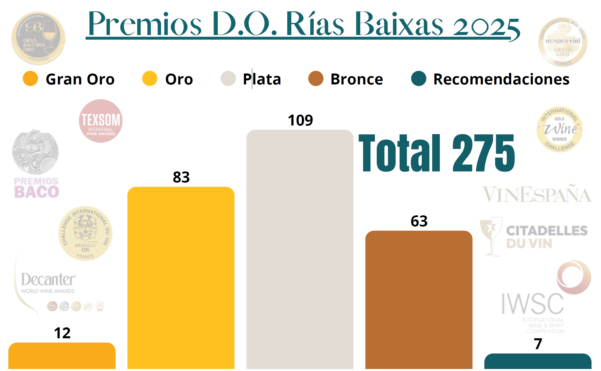 Los premios en concursos siempre son bien recibidos por ambas partes. Por el sector vinícola, porque le da brío en su trabajo diario. Y por el consumidor, porque son una guía a la hora de elegir una marca o una región vitivinícola. Esta situación es sabida por las bodegas que integran la Denominación de Origen Rías Baixas, que cada año se afanan por presentar su trabajo ante exigentes paneles de jurados de certámenes nacionales e internacionales. El resultado en 2025 ha sido muy positivo, pues han recibido un total de 274 galardones en su participación en concursos enológicos nacionales e internacionales. Estos premios se obtuvieron en 11 citas establecidas en el calendario oficial de la Organización Internacional de la Viña y el Vino (OIV) a las que han concurrido las distintas bodegas adscritas a la denominación desde enero hasta diciembre de 2025.