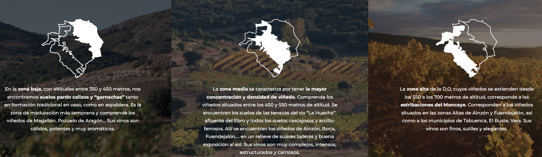como su nombre indica, los viñedos se extienden desde los 550 a los 700 metros de altitud y se corresponden ya con las estribaciones del Moncayo. En esta zona encontraremos vinos finos, sutiles y elegantes. Los viñedos se encuentran en las zonas Altas de Ainzón y Fuendejalón, así como a los municipios de Tabuenca, El Buste, Vera.